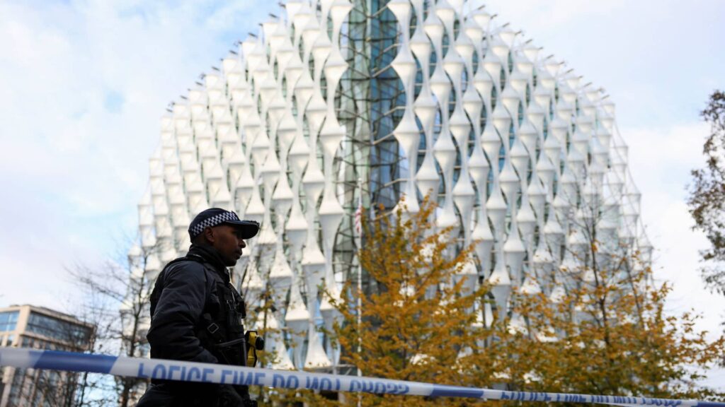 Poliisi seisoo Yhdysvaltain suurlähetystön edessä Lontoossa 22. marraskuuta 2024 tapahtuneen tapauksen johdosta meneillään olevan tutkimuksen aikana.